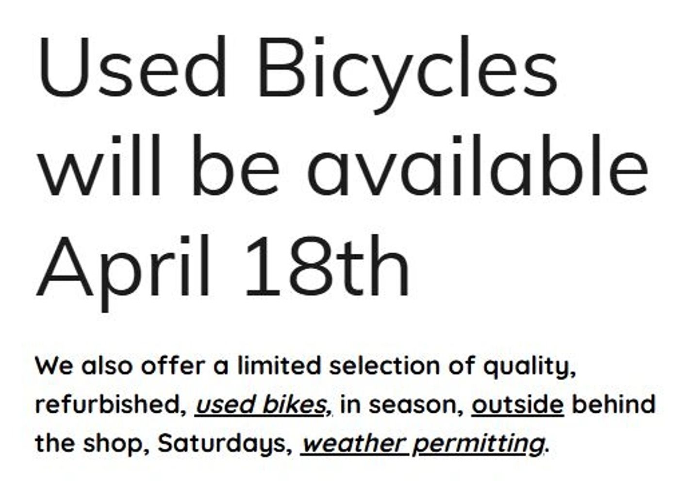 We also offer a limited selection of quality, refurbished, used bikes, in season, outside behind the shop, Saturdays, weather permitting.
